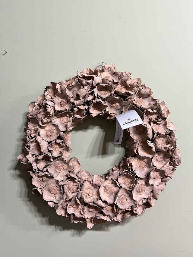 Der Palm Cup Kranz „Blush“ von Couronne ist ein großformatiger, handgefertigter Naturkranz mit ausdrucksstarker Struktur. Gefertigt aus getrockneten Palm-Cup-Schalen, besticht er durch seine organische Blütenform und die sanfte Blush-/Altrosa-Färbung, die dem Kranz eine warme, elegante Ausstrahlung verleiht.