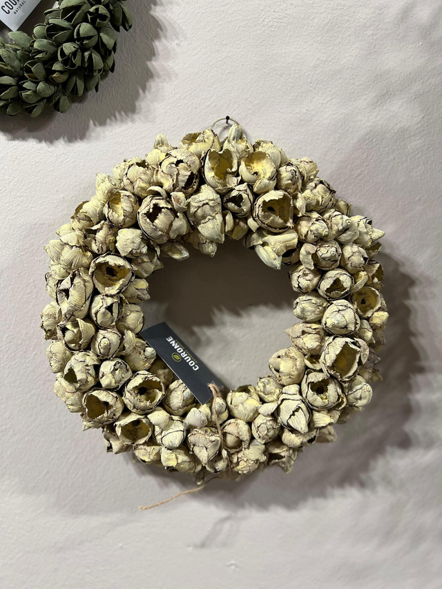 Der Naturkranz „Coco“ von Couronne überzeugt durch seine authentische, handwerkliche Optik und natürliche Ausstrahlung. Gefertigt aus getrockneten Coco-Fruchtschalen, erhält der Kranz durch das Old Green Wash oder Yellow Sand Finish einen ruhigen, leicht patinierten Grün/Gelbton mit besonderer Tiefe und Struktur. Jedes Stück ist ein Unikat und lebt von kleinen Unregelmäßigkeiten, die seinen natürlichen Charakter unterstreichen.