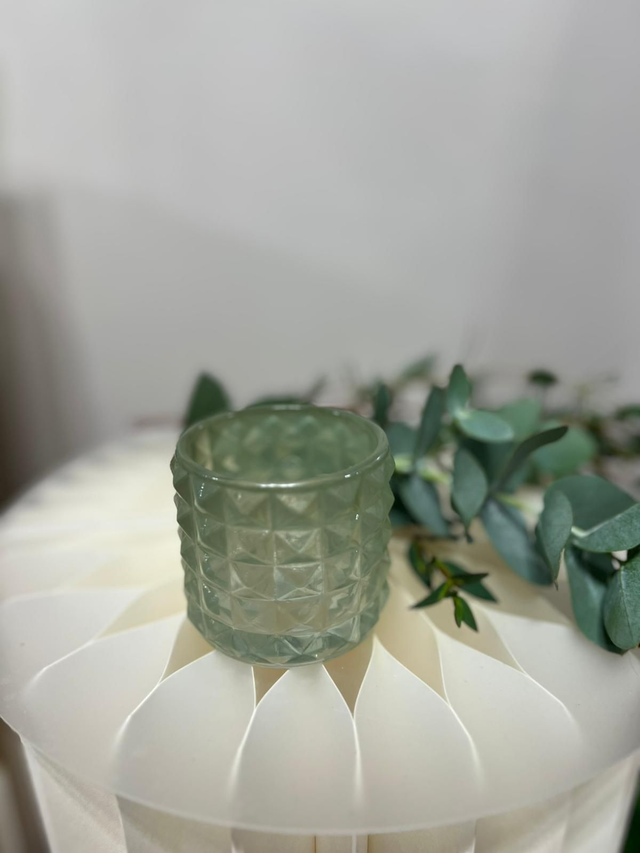 Modernes Windlicht aus strukturiertem Glas in edlem Grün. Das geometrische Relief bricht das Kerzenlicht sanft und sorgt für eine warme, gemütliche Atmosphäre – ideal für Tisch, Regal oder Fensterbank.